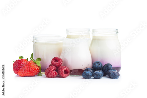 White fruity yogurt in jar and strawberries, blueberries, raspberries
