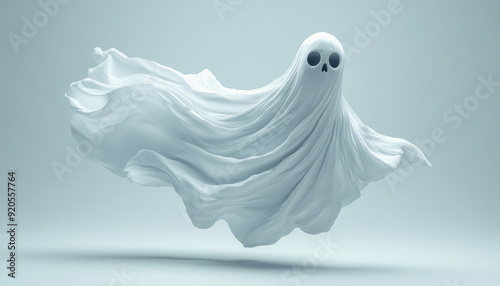 White ghost floating with skull face on blue background
