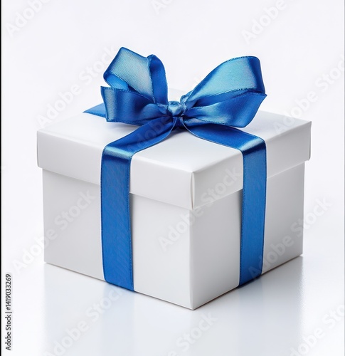 White gift box with blue ribbon isolated on white background minimalistic modern Scandinavian style