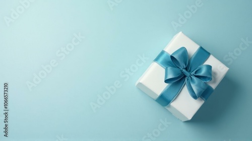 White Gift Box With Blue Satin Ribbon On Smooth Light Blue Background
