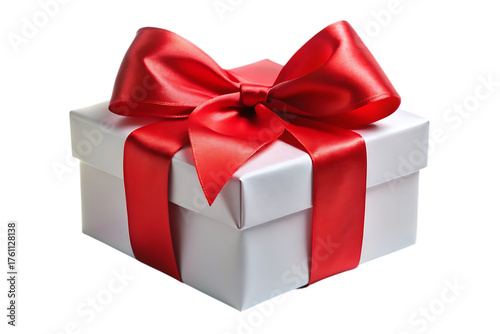White Gift Box with Bright Red Ribbon and Bow, a Cutout, PNG Isolated on a Transparent Background