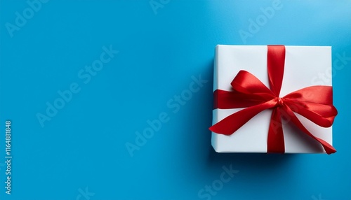 White Gift Box with Red Ribbon on Sky Blue Background. Top View of Children Day Gifts with Copy Space
