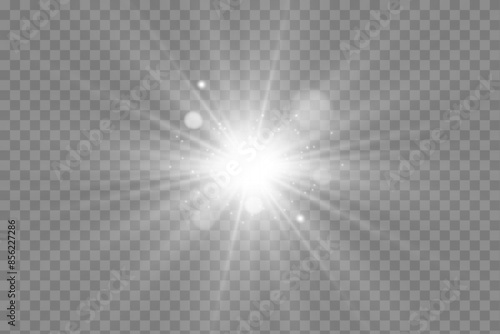 White glowing light explodes on a transparent background. Bright Star. Transparent shining sun, bright flash. Vector graphics.
