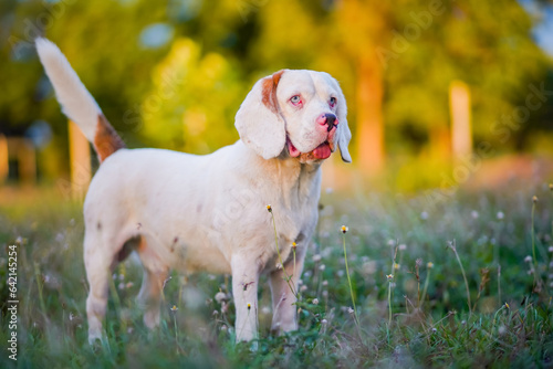 White hair beagle dog standing on the wild flower field in the park in the evening.