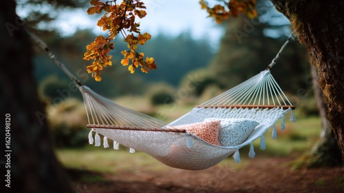 White hammock with soft pillows hangs between trees, autumn leaves on branch, cozy relaxation at nature forest