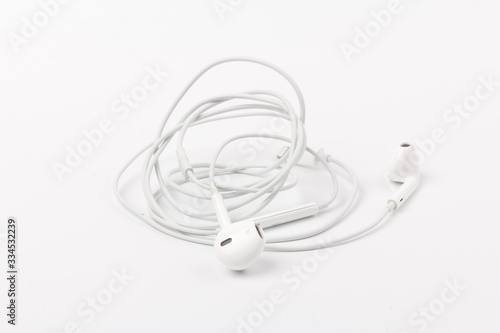 White headphones for listening to music and sound on portable devices: music player, smartphone, laptop and jack for connection on a white background.