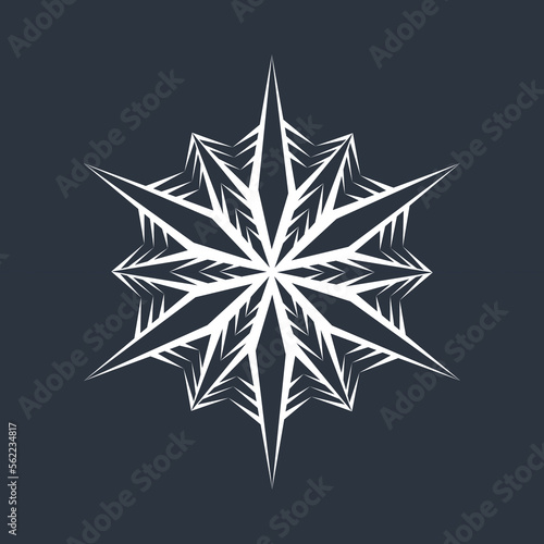 White hexagonal snowflake on a dark background. A unique author's snowflake to decorate the winter holidays. Vector image of a Christmas symbol.