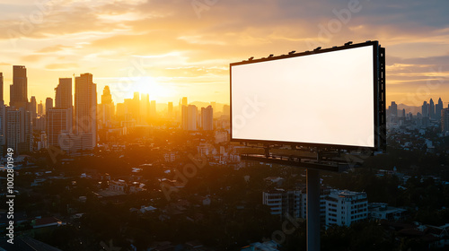 White horizontal billboard mockup on a city rooftop, panoramic cityscape stretching into the horizon, white horizontal billboard mockup cityscape, rooftop advertising