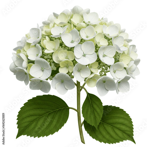 White Hydrangea Blossom with Green Leaves on Transparent Background