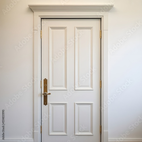White Interior Colonial-Style Door with Brass Lever Handle – Four-Panel Design Framed by Decorative Molding on White Background