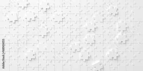 White jigsaw puzzle pieces on a bright white background, creating a clean, minimalist aesthetic, strategy, isolated