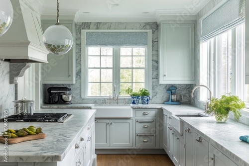 White Kitchen with Marble Countertops and Window with Blue Blinds