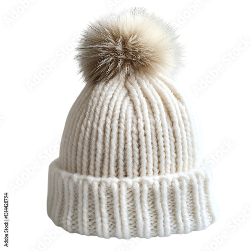 White Knit Hat with Fluffy Pom Isolated on Transparent Background