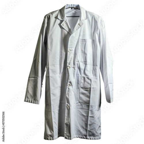 White lab coat hanging on a white background, isolated, suitable for medical, scientific, or professional usage.