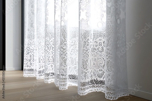 White lace curtains in modern interior with natural light, creating a soft and airy ambiance