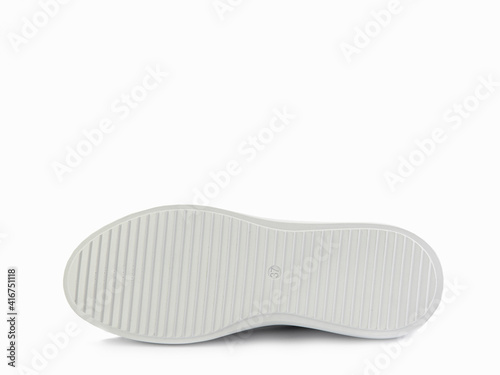 White leather sneakers with black details. Casual women's style. White lacing and white rubber soles. Isolated close-up on white background. Shoe sole view. Fashion shoes.