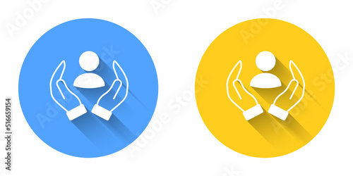 White Life insurance icon isolated with long shadow background. Security, safety, protection, protect concept. Circle button. Vector
