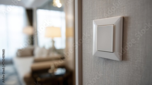 White light switch on textured wall, concept of easy power control and modern interior design, with blurred room in background.
