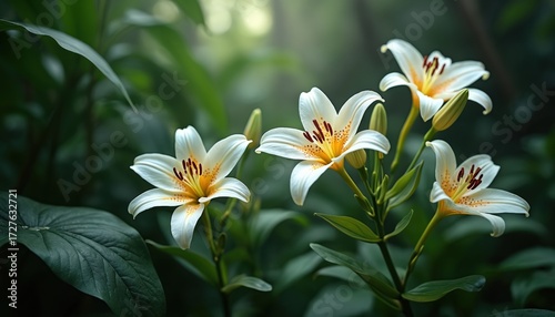 White lilies with spotted centers bloom amidst dense green foliage and dark shadows. Delicate petals unfurl in a secluded jungle setting, showcasing natural beauty.