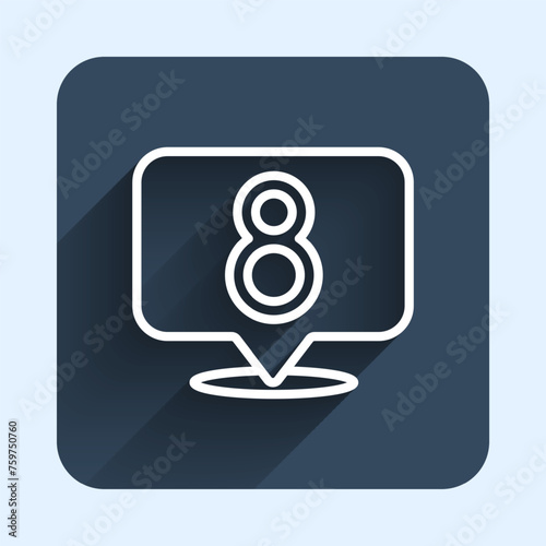White line 8 March icon isolated with long shadow background. International Happy Women Day. Blue square button. Vector