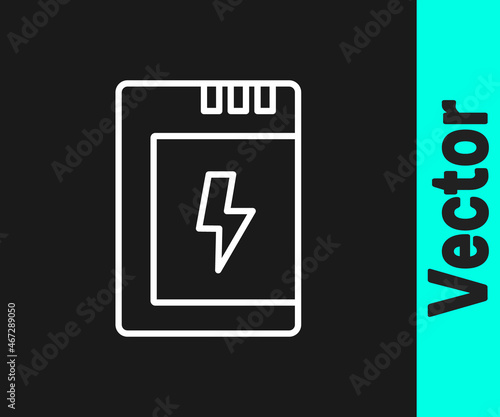White line Battery for camera icon isolated on black background. Lightning bolt symbol. Vector