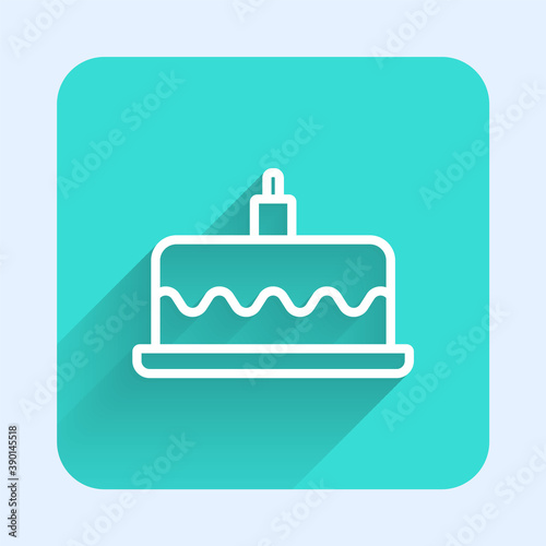 White line Cake with burning candles icon isolated with long shadow. Happy Birthday. Green square button. Vector.