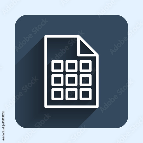 White line Lottery ticket icon isolated with long shadow background. Bingo, lotto, cash prizes. Financial success, prosperity, victory, winnings luck. Blue square button. Vector