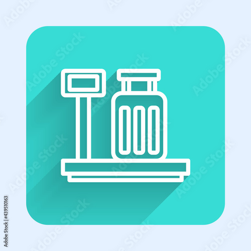 White line Scale with suitcase icon isolated with long shadow background. Logistic and delivery. Weight of delivery package on a scale. Green square button. Vector