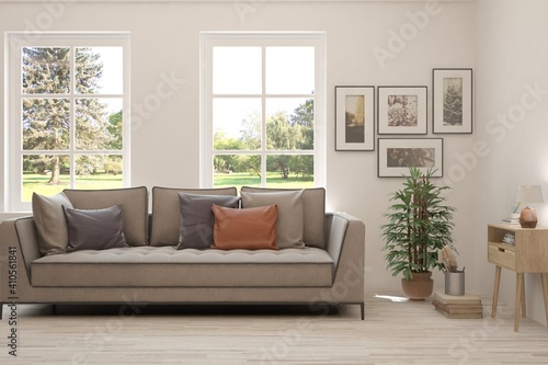 White living room with sofa and summer landscape in window. Scandinavian interior design. 3D illustration