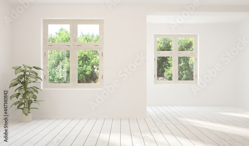 White living room with sofa and summer landscape in window. Scandinavian interior design. 3D illustration