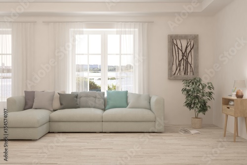 White living room with sofa. Scandinavian interior design. 3D illustration