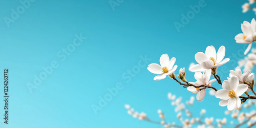 White magnolia flowers against blue sky. Spring nature and gardening content