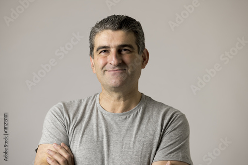 white man 40 to 50 years old smiling happy showing nice and positive face expression isolated on grey background