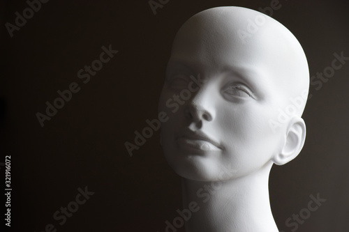 White mannequin head with neutral face expression and dark background