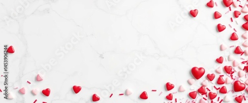 White marble background with corner border of Valentine's Day candy heart sprinkles, marble, red