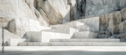 White marble steps against a rocky mountain backdrop.