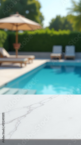 white marble tabletop features blurry outdoor pool scene loungers