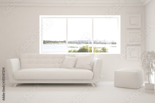 White minimalist living room with sofa. Scandinavian interior design. 3D illustration