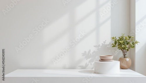 White minimalist pedestal stand displaying decorative vase and bowl in bright modern room with natural light