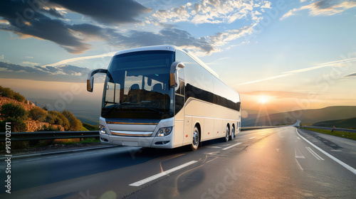 White modern comfortable tourist bus driving along the highway in bright sunlight. Travel and bus tourism concept.