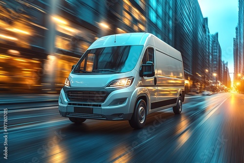 White modern delivery small shipment cargo courier van moving fast on motorway road to city