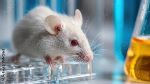 White Mouse on Glass Shelf Medical Research Focus, Ideal for Healthcare Campaigns, Evoking Sense of Curiosity and Progress.