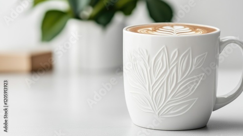 White mug with leaf pattern holding latte, blurred plant in background