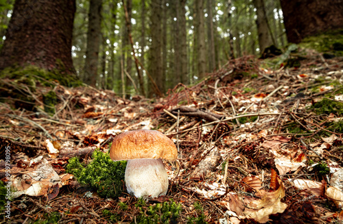 White mushroom in a mountain forest. Wet forest with mushrooms.