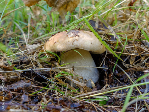 White mushroom or as it is called the royal mushroom that grew in the grass on the ground.