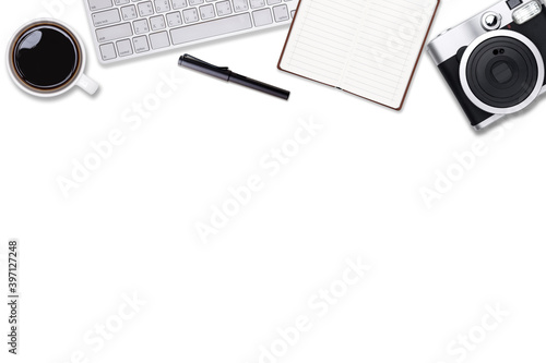 white office desk table with office supplies. Top view with copy space. Flat lay.