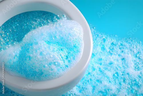White open toilet bowl is filled with sparkling blue detergent creating bubbles and foam, suggesting cleaning and hygiene on a vibrant blue concentric background