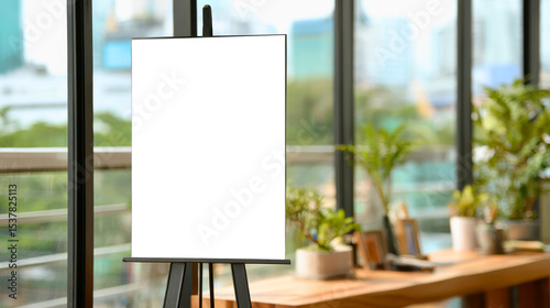 White or transparent poster mockup on easel in indoor space with greenery and daylight, perfect for design and promotional visual displays