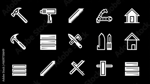 White outline tools icons on a dark background. Tools include hammer, drill, saw, house