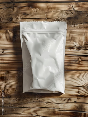 White Packaging Bag Mockup on Wooden Table, Top View with Header Seal for Product Presentation.